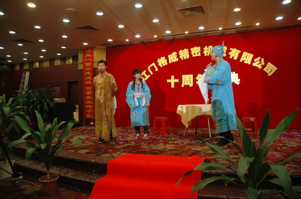 2012年3月25日是江門(mén)格威精密機(jī)械有限公司成立十周年的大喜之日,為了慶祝十年廠(chǎng)慶,公司組織了一系列豐富多彩的慶典活動(dòng),如出公司廠(chǎng)報(bào),出畫(huà)冊(cè),制作公司發(fā)展歷程的視頻,25日晚還組織了隆重的聚餐、娛樂(lè)表演暨2011年度優(yōu)秀員工頒獎(jiǎng)和十年老員工頒獎(jiǎng)活動(dòng)。全廠(chǎng)員工歡聚一堂,在大家的歡聲笑語(yǔ)中,在高層領(lǐng)導(dǎo)和各位同仁的觥籌交錯(cuò)中,我們的慶典活動(dòng)在當(dāng)晚八點(diǎn)鐘圓滿(mǎn)結(jié)束了。